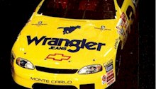 Earnhardt, his Chevrolet Monte Carlo painted with the blue and yellow Wrangler Jeans